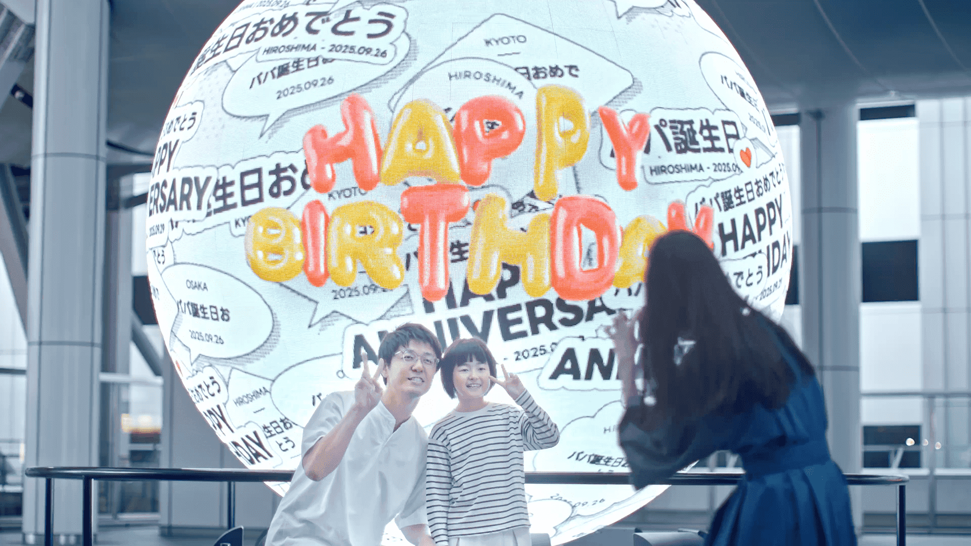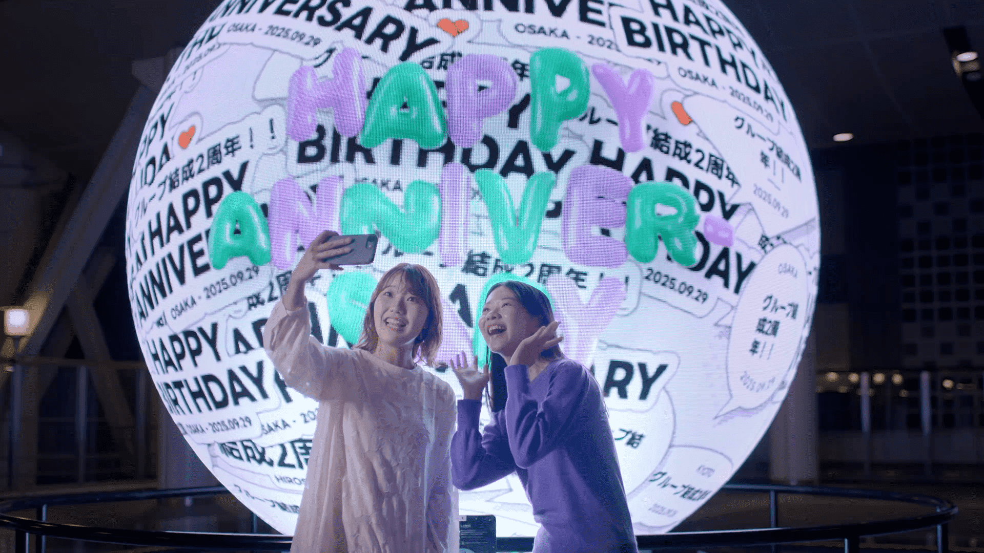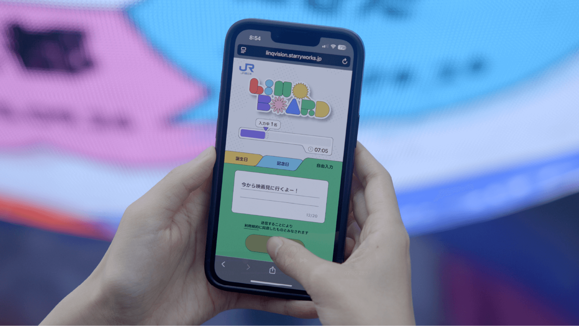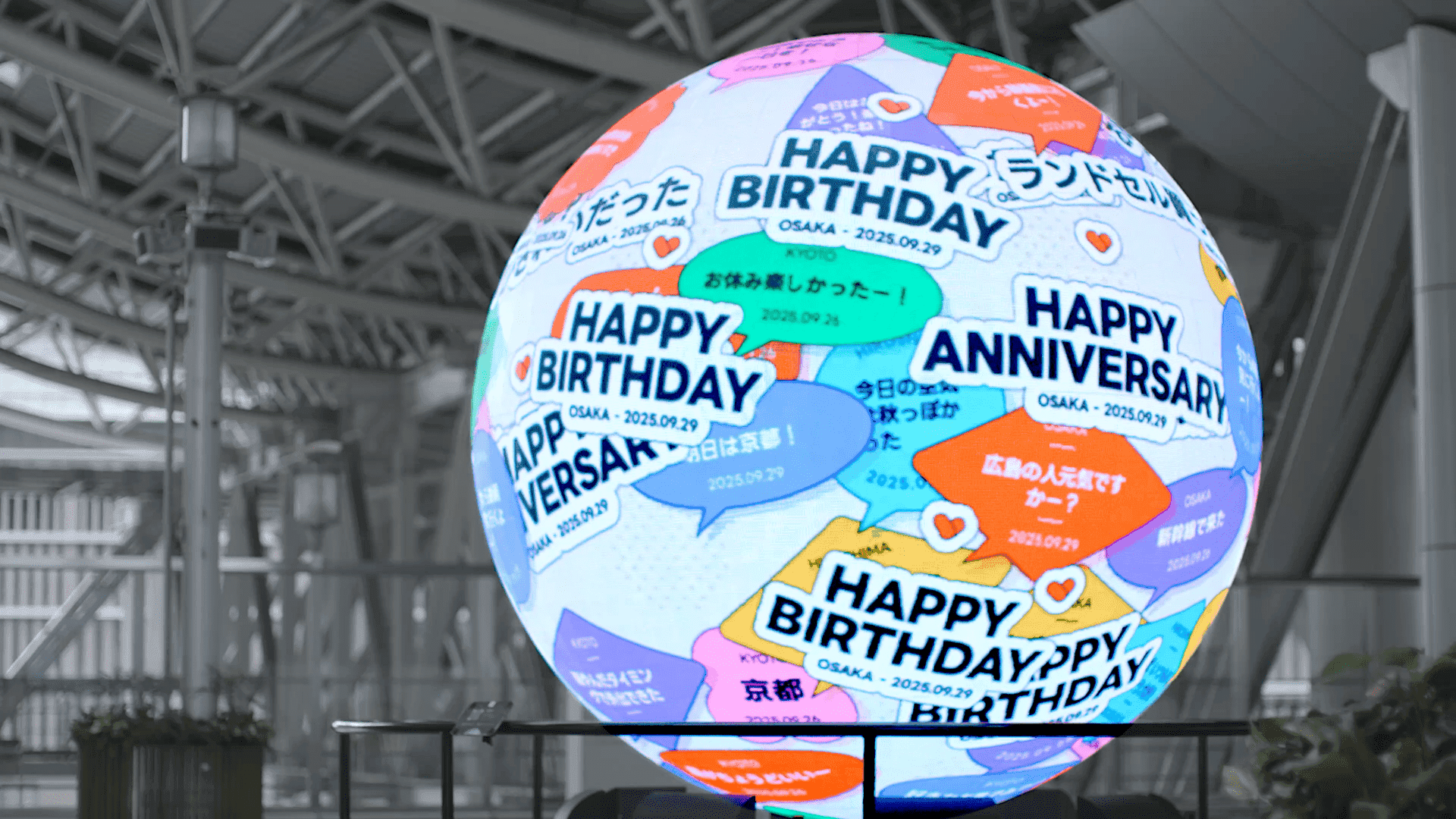 JR大阪駅、JR京都駅、JR広島駅の三拠点に設置された球体ビジョン「LINQ VISION」に、スマートフォンからステッカーとしてメッセージを残せる、掲示板サイネージコンテンツを制作しました。 投稿された内容は3拠点で連動しているため、他拠点へのメッセージを送ることもできます。また、「Happy Birthday」と「Happy Anniversary」モードでは特別演出が発生し、すべてのステッカーのテキストが一定時間入力された内容に変化し、音楽とともにお祝いします。 公共の場に設置されたサイネージに投影されるユーザー生成コンテンツを安全に運用するために、AIを使った検閲システムを構築しました。
